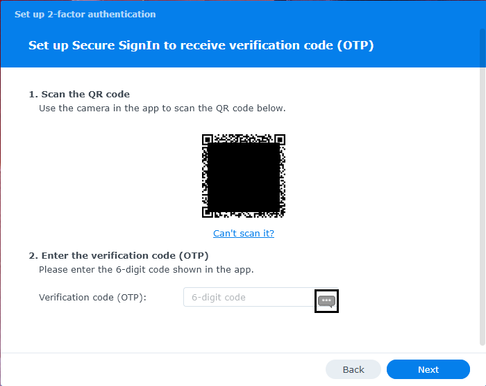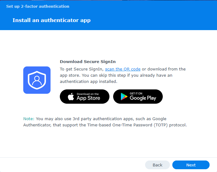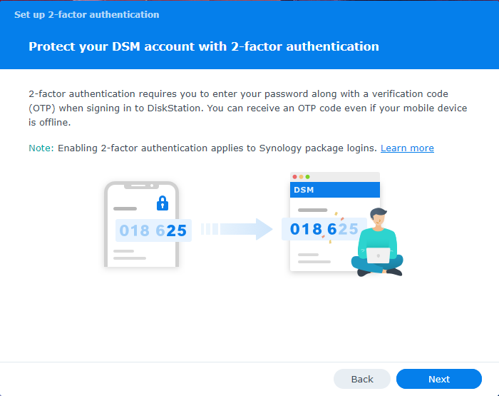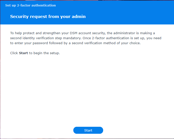 The first step is to try logging into the NAS with your credentials. If the NAS has 2FA being enforced, you will be greeted by this popup before being able to access anything. Click “Start” to continue.