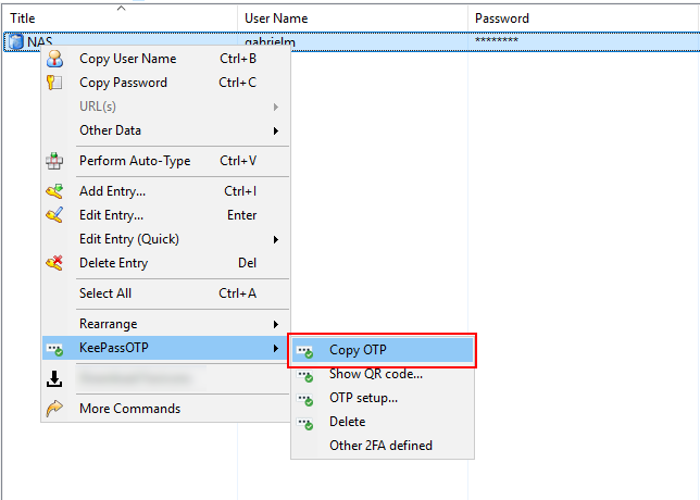 Still in KeePass, right-click on the entry and select “Copy OTP” from the “KeePassOTP” option. This will copy the current OTP code into your clipboard.