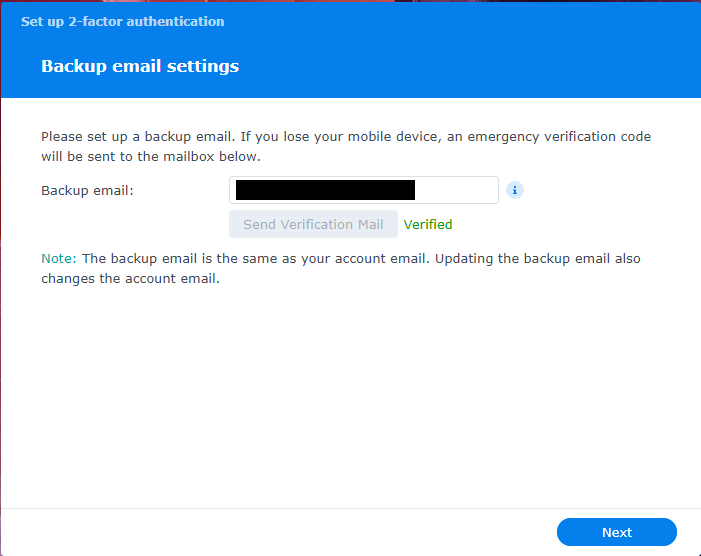 Once successful, you can then enter the email address you’d like to use as a backup method. It will send you an email to verify it’s a valid address. The email will have a link that you click that will validate the address. Once validated, it will say “Verified” in green. Click “Next” to continue.