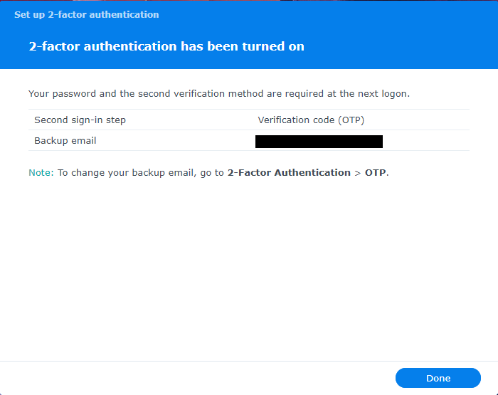 This is the final screen informing you that OTP has been enabled and activated for your account. Click on “Done” to close this out.
