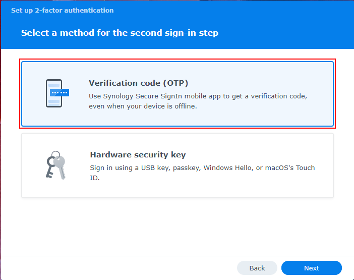 Next, you’ll be presented with an option of which type of method you’d like to use. Select the “Verification code (OTP)” method then click on “Next”.