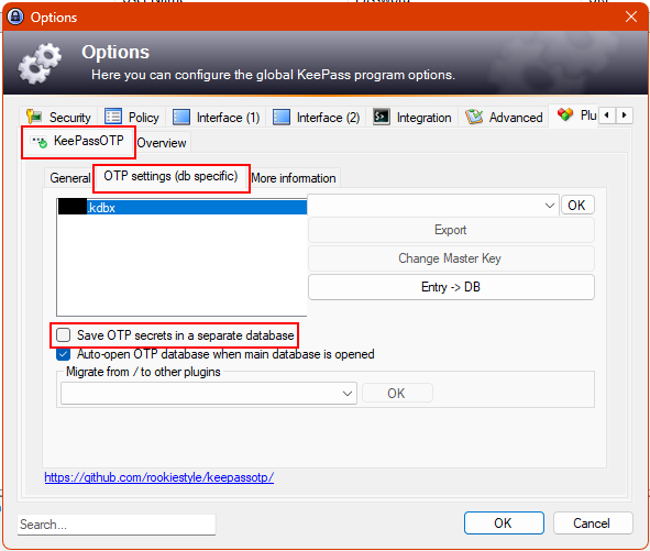 Once the Options menu is open, navigate to the “KeePassOTP” tab, click on “OTP settings (db specific)” and uncheck Save “OTP secrets in a separate database”. Click “OK” to save these changes.