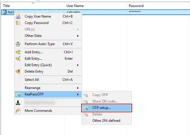 Next, still in KeePass, right-click on the entry and select “OTP setup…” from the “KeePassOTP” option.