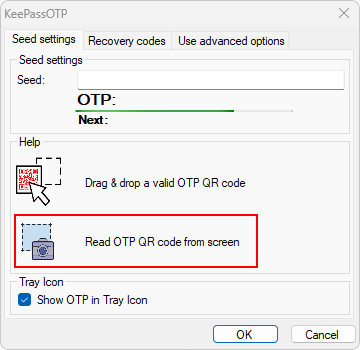 This will open a new popup to now read in the QR code. Click on “Read OTP QR code from the screen” and it will automatically read the QR code and populate the “Seed” field. Click “OK” when it’s done.